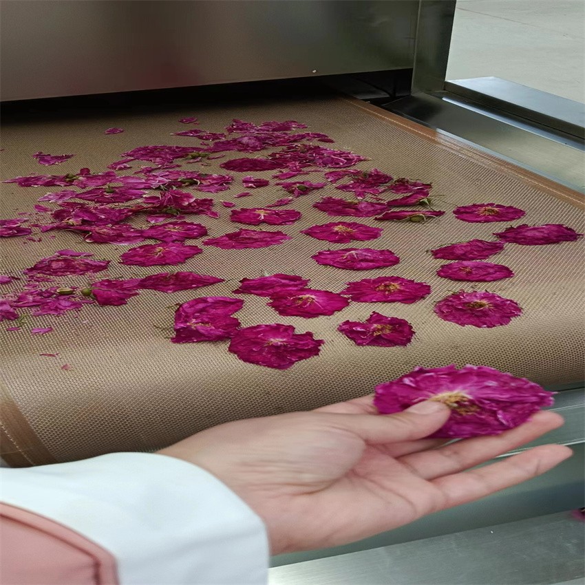 就拿鮮花來說吧,從鮮花的采摘到烘干只需要短短幾分鐘的時間,就可以把一朵鮮花烘干成顏色亮麗,香味濃郁的干花,既可以放臥室當香薰,又可以直接沖水飲用。而且微波烘干機還可以殺菌,滅蟲卵,不需要防腐劑就可以延長花朵的保質期。烘干過程中不產生廢水、廢氣、廢渣,環保又衛生。整機食品級不銹鋼制造,有效抑制微波的外泄,安全有保障??靵韺嵉貐⒂^一下吧?。?!