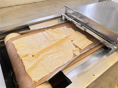 微波烘干設備的工作原理是利用微波的高頻電磁波使物料中的水分子快速振動,從而產生熱量,實現物料的快速烘干。與傳統熱風烘干相比,微波烘干具有加熱均勻、速度快、能耗低等顯著優勢。在豆皮加工過程中,微波設備可以在短時間內完成烘干任務,縮短了生產周期,提高了生產效率。同時,由于微波加熱是從物料內部開始,避免了傳統干燥方式中因表面過熱導致的焦糊現象,從而確保了豆皮的口感和色澤。