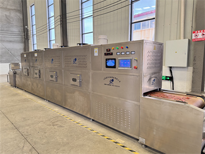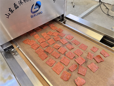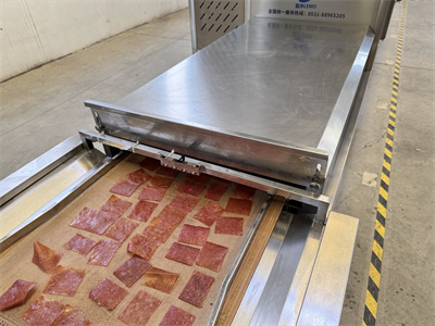 切片、腌制和初步烘干的半成品肉片生產完成,就輪到微波隧道爐大顯身手了。這種設備看起來像一條長長的金屬通道,里面排列著微波發生器。傳送帶載著肉片緩緩通過時,微波能量會直接作用于肉片內部的水分子,讓水分子高速振動產生熱量。和傳統熱風烘干相比,微波加熱有個很大的優勢:它不是從外向內慢慢傳導熱量,而是能讓整片肉同時受熱。這就避免了表面烤焦而內部還沒干透的情況,烘干效率能提高好幾倍。