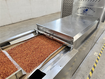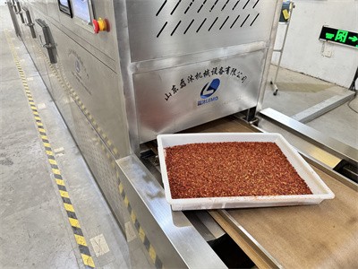 這種微波干燥設(shè)備就像一條長長的隧道,辣椒碎在傳送帶上緩緩?fù)ㄟ^時,會接受均勻的微波照射。與傳統(tǒng)熱風(fēng)烘干不同,微波是從辣椒內(nèi)部開始加熱,水分被迅速汽化排出。