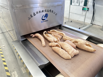 首先,將豬皮被均勻放置在傳送帶上,緩緩進入微波腔體。微波腔內,高頻電磁波穿透豬皮,激發其內部水分子的快速振動,產生熱量。這種由內而外的加熱方式,使得豬皮在短時間內迅速升溫,水分迅速蒸發形成大量微小氣泡,這些氣泡在豬皮內部不斷膨脹,最終使豬皮體積增大、質地變得酥脆。整個膨化過程快速而高效率,且無需添加任何化學膨松劑,確保了成品的天然與健康。