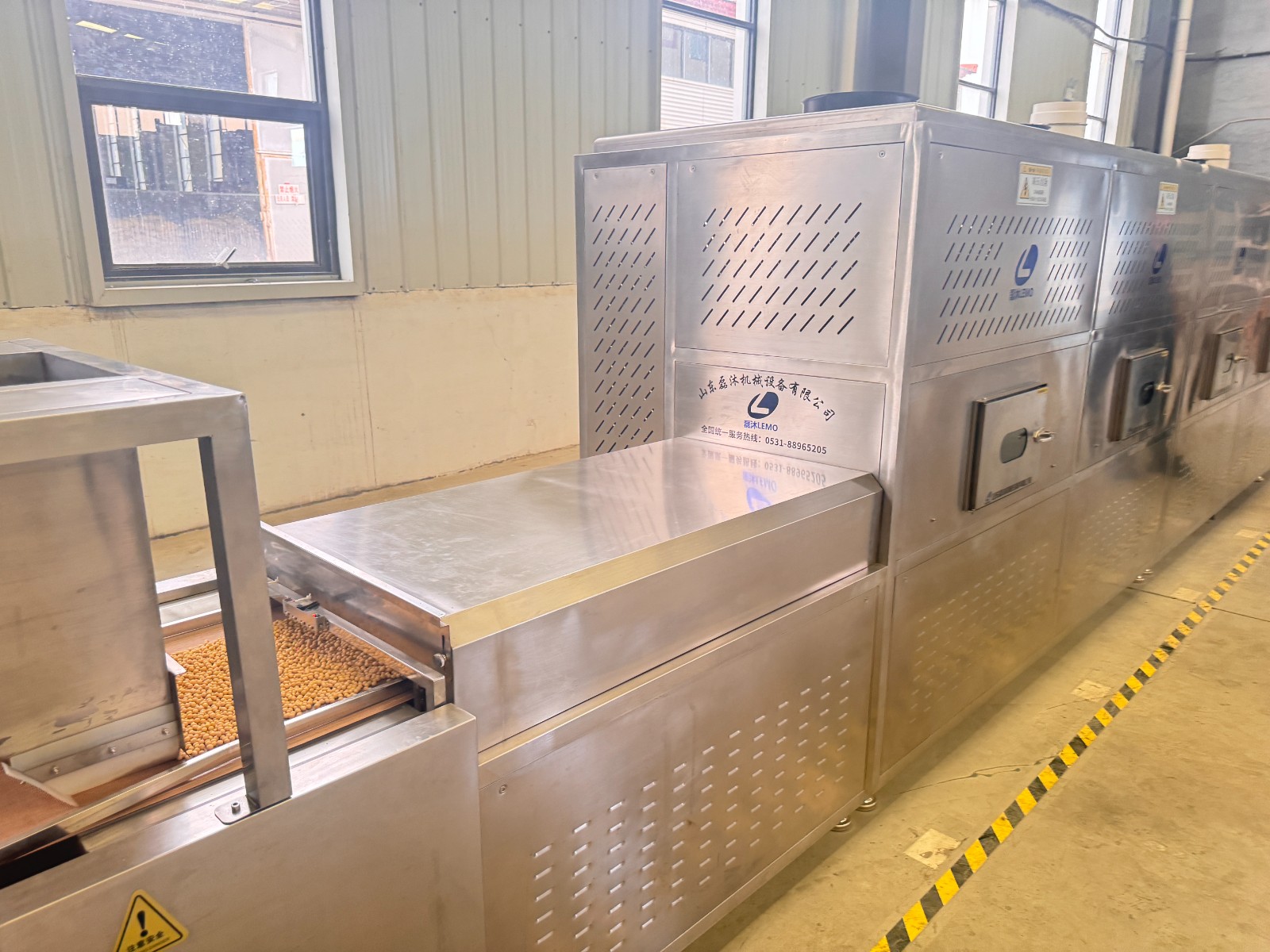 工業微波隧道爐為黃豆烘烤提供了完全不同的加熱邏輯。微波能量能夠直接穿透黃豆堅硬的種皮,無需依賴任何介質,便可在豆粒內部激發水分與油脂分子的高速運動并轉化為熱量。當黃豆均勻鋪展在傳送帶上、以設定的速度穿過微波隧道時,熱量并非從外部緩慢導入,而是在豆粒的內部同步生成。豆芯與表層的熟化進程由此變得協調,內外同步完成從生到熟的轉變。